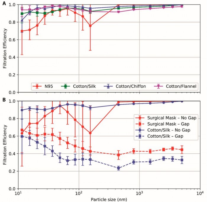 一篇最新发布的论文[PDF]对自制口罩进行了深入研究,以及使用哪种材料最能过滤潜在的污染颗粒。研究人员发现在紧密贴合面部的情况下,使用涤纶(Polyester)和氨纶(Spandex)组成的雪纺布(chiffon)能够提供接近于N95口罩的防护效果。
