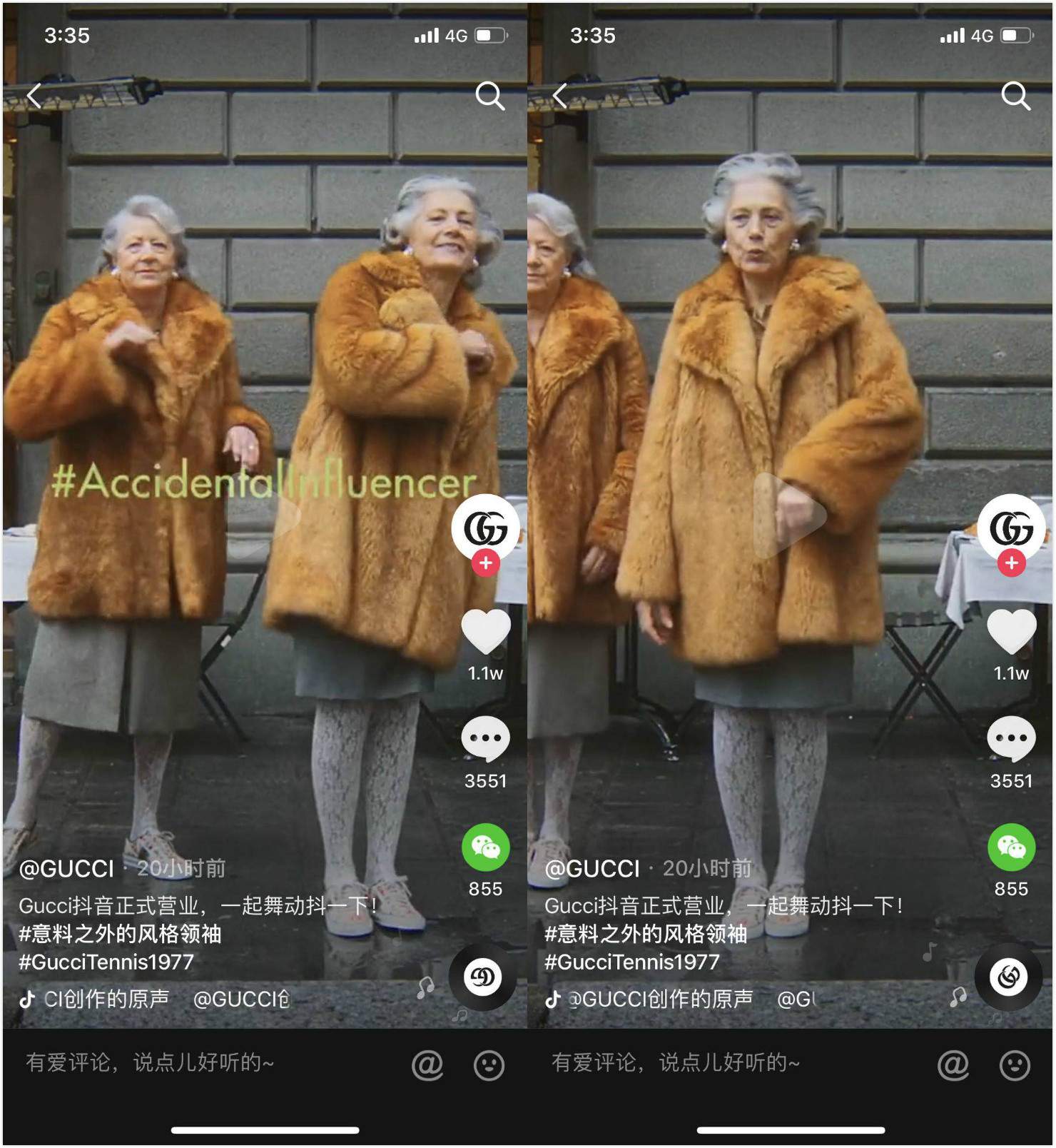 截至发稿前,Gucci 抖音账号粉丝数量为2.2万,品牌所发布的第一条短视频为两位老年模特穿着泰迪熊外套和复古运动鞋在街头舞动的画面,配文为“一起舞动抖一下”。视频中的音乐听起来似乎也很有抖音专属BGM。